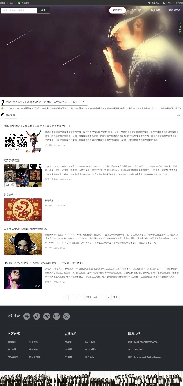 中国迈迷网成立于2025年1月12日,是迈克尔·杰克逊中国歌迷自发创建的非营利性歌迷网上平台,也是一个集MJ资讯共享MJ文化传播为一体的迈迷庇护所。